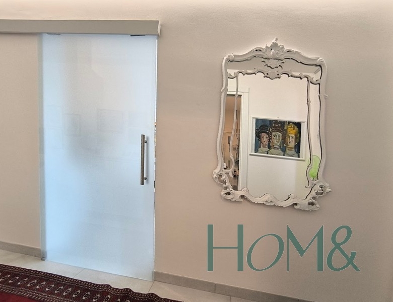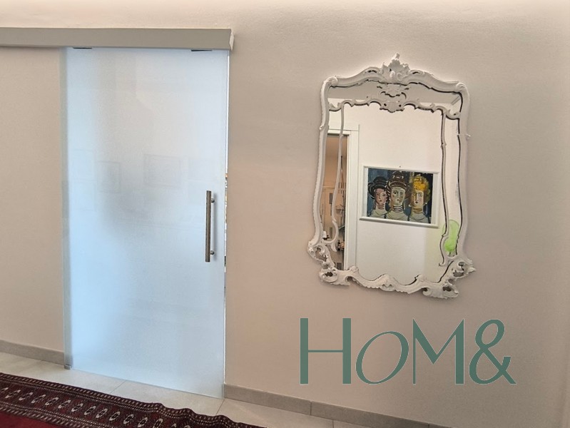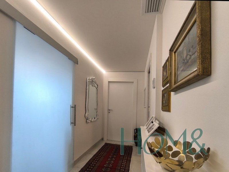 Appena entri c’è un corridoio comodo reso luminoso dalla porta scorrevole in vetro satinato che si apre verso la zona giorno